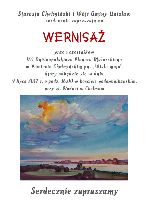 Starosta Chełmiński i Wójt Gminy Unisław zapraszają na wernisaż prac uczestników VII Ogólnopolskiego Pleneru Malarskiego - szczegóły na plakacie.