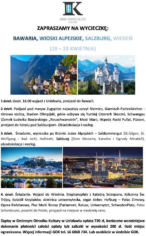 Wyjazd w środę 19 kwietnia o godz. 18.00, planowany powrót na miejsce w niedzielę rano 23 kwietnia. W programie m.in.: Podjazd pod masyw Zugspitze najwyższy szczyt Niemiec, Garmisch-Partenkirchen - zimowa stolica, Stadion Olimpijski, gdzie odbywa się Turniej Czterech Skoczni, Schwangau (Zamek Ludwika Bawarskiego „Neuschwanstein”, Most Marii, Wąwóz Rzeki Pullat, Füssen, wycieczka po Krainie Jezior Alpejskich – Salzkammergut (St.Gilgen, St. Wolfgang - Bad Ischl, Hallstatt, Salzburg (Dom Mozarta, Katedra i Ogrody Mirabell), Zwiedzanie w Wiedniu - Stephansplatz z Katedrą Szczepana, Kolumna Św. Trójcy, Kościół Krzyżaków, dzielnica uniwersytecka, zegar Anker, Hofburg – Pałac Zimowy, Opera Państwowa, Plac Marii Teresy (Parlament, Ratusz, Uniwersytet, SchwedenPlatz, Pałac Schonbrunn.