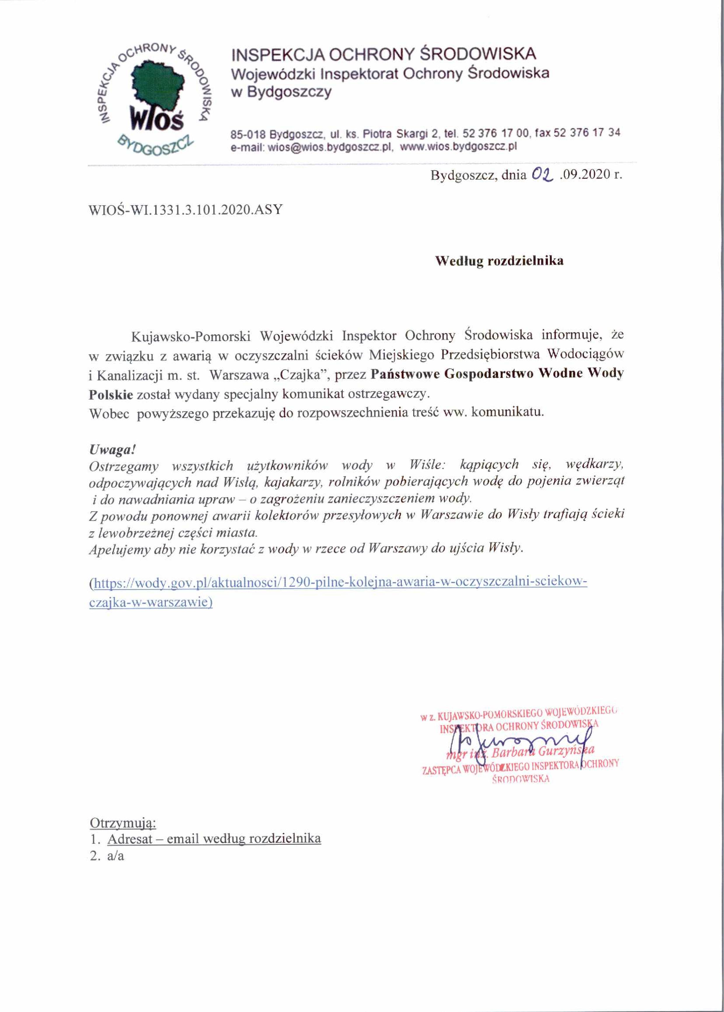 A A A Komunikat Wojewódzkiego Inspektoratu Ochrony Środowiska w związku z awarią oczyszczalni Warszawa „Czajka"