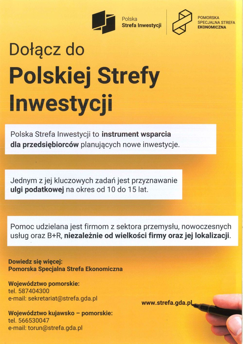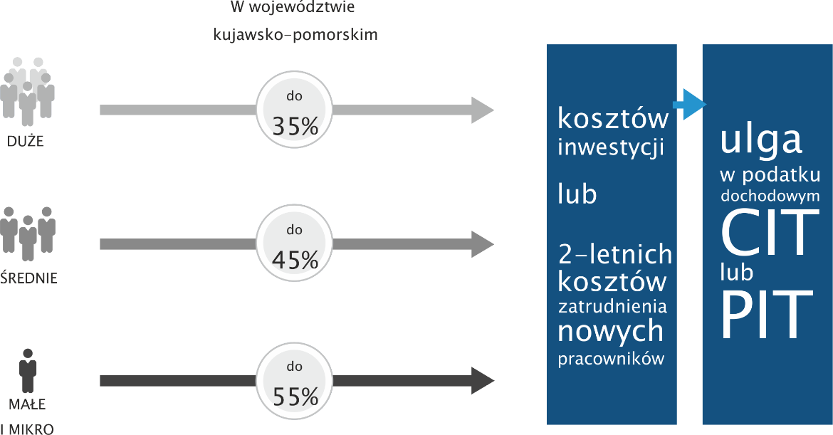 Pomorska Specjalna Strefa Ekonomiczna umożliwia prowadzenie działalności gospodarczej na preferencyjnych warunkach. Przedsiębiorcy mogą korzystać z pomocy publicznej w formie zwolnienia z podatku dochodowego (PIT lub CIT) zarówno dla istniejących przedsiębiorstw jak i nowych projektów.