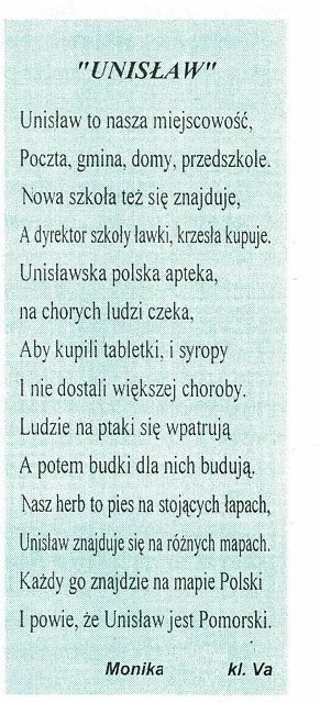 "UNISŁAW' Unisław to nasza miejscowość, Poczta, gmina, domy, przedszkole. Nowa szkoła też się znajduje, A dyrektor szkoły ławki, krzesła kupuje. Unislawska polska apteka, na chorych ludzi czeka, Aby kupili tabletki, i syropy I nie dostali większej choroby. Ludzie na ptaki się wpatrują A potem budki dla nich budują. Nasz herb to pies na stojących łapach, Unisław znajduje się na różnych mapach. Każdy go znajdzie na mapie Polski I powie, że Unisław jest Pomorski. Monika	kl. Va