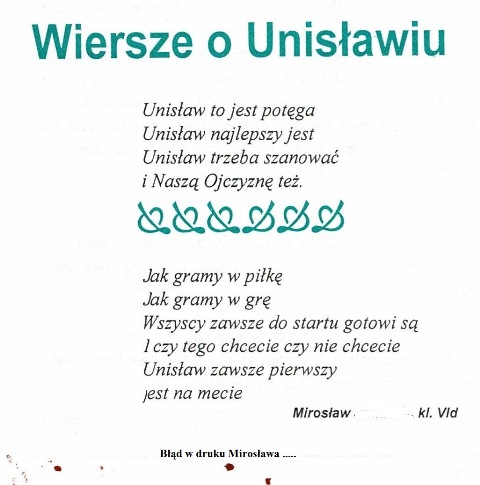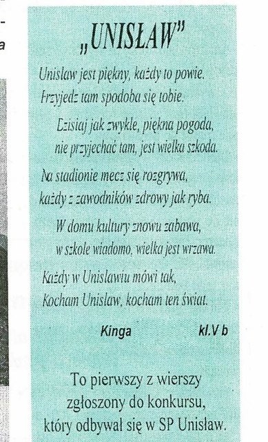 Unisław jest piękny, każdy topowie. f-rzyjedz tam spodoba się tobie; Dzisiaj jak zwykle, piękną pogoda, nie przyjechać tam, jest wielka szkoda, Na stadionie mecz się rozgrywa, każdy: zawodników zdrowy jak ryba. W domu kultury znowu zabawa, w szkole wiadomo, wielka jest wrzawa każdy w Unislawiu mówi tak, Kocham Unisław, kocham ten świat.  Kinga	kl.Vb