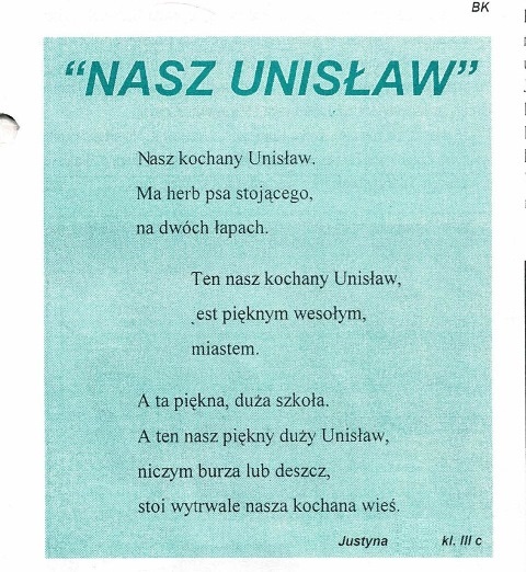 Nasz kochany Unisław. Ma herb psa stojącego, na dwóch łapach.  Ten nasz kochany Unisław, jest pięknym wesołym, miastem  A ta piękna, duża szkoła. A ten nasz piękny duży Unisław, niczym burza lub deszcz, stoi wytrwale nasza kochana wieś.