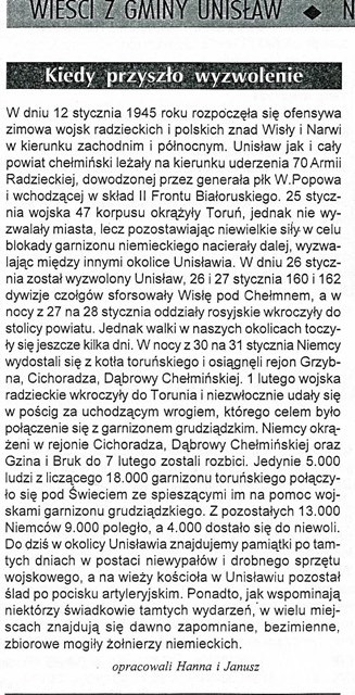 26.01.1945 r. Unisław został wyzwolony spod okupacji niemieckiej. Jak piszą Hanna i Janusz Medoniowie, w opracowanym artykule „Kiedy przyszło wyzwolenie”, (Unislavia nr 2,  1995) „….W dniu 26 stycznia został wyzwolony Unisław, 26 i 27 stycznia 160 i 162 dywizje czołgów sforsowały Wisłę pod Chełmnem, a w nocy z 27 na 28 stycznia oddziały rosyjskie wkroczyły do stolicy powiatu……”.
